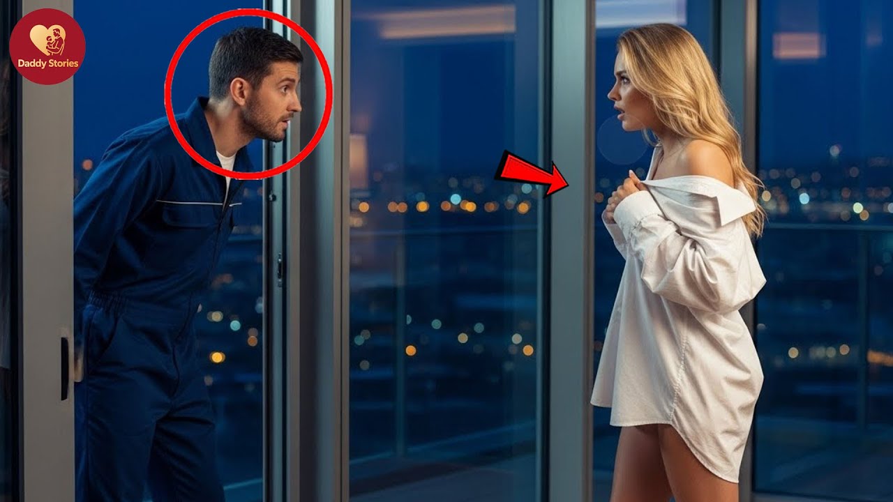 The corporate building, late evening, almost empty. Noah Pierce, 33, single dad, maintenance worker. He was called to fix a light in the company gym. He knocked on the door, no answer. Assumed the room was empty. He opened the door and froze. CEO Aria Lockhart, 30 years old, changing her shirt, half dressed in front of the mirror.