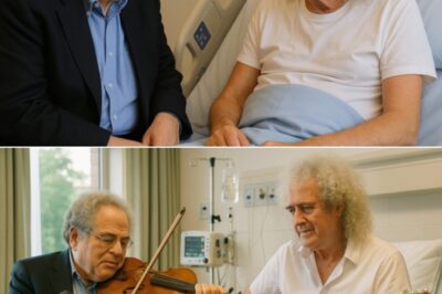 The hospital room grew still when Itzhak Perlman arrived to visit Brian May, the legendary violinist wheeled in with quiet dignity to see his longtime friend, who has been recovering from a recent health scare, and witnesses described how Perlman, setting his violin case beside the bed, took Brian’s hand and whispered, “I came to play for you,” before unpacking his instrument and filling the sterile space with a tender, unaccompanied rendition of “Somewhere Over the Rainbow,” each trembling note carrying the weight of friendship, healing, and shared history, and Brian, visibly frail but deeply moved, closed his eyes as tears streamed down his face, his fingers tapping weakly against the sheets in time with the melody, while nurses and family gathered silently at the door, one later saying, “It felt like watching two legends speak to each other in a language only they understood,” and when the final note lingered and dissolved into stillness, Perlman gently patted Brian’s hand, leaving behind a room thick with gratitude, love, and the quiet magic of music.