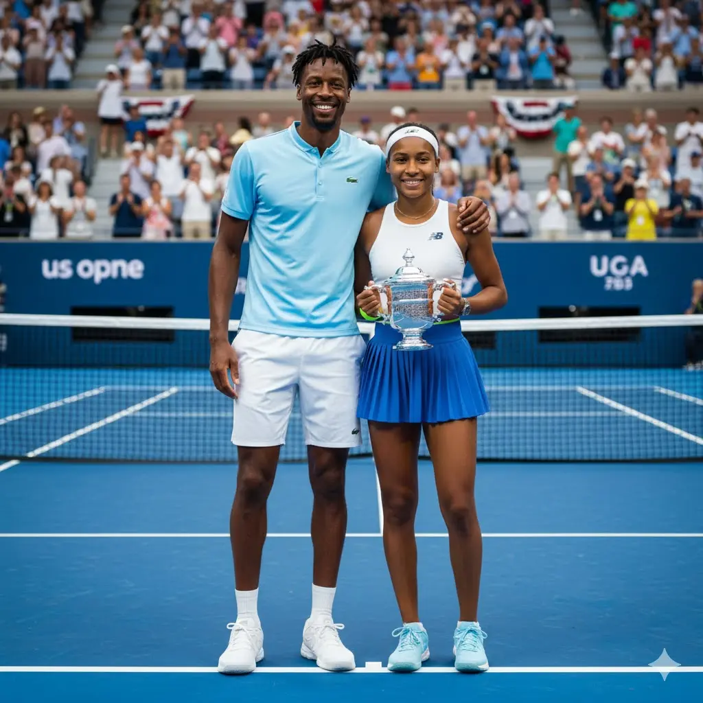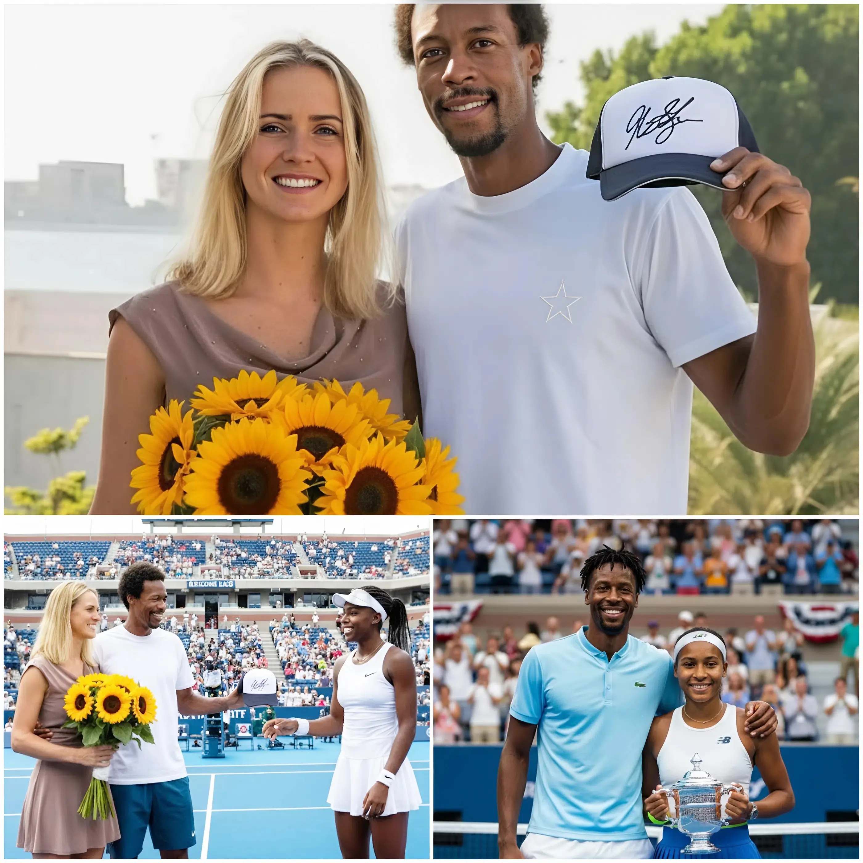 Elina was holding a beautiful bouquet of white lilies and yellow roses — the same flowers Coco’s grandmother used to bring her after junior tournaments. Coco noticed immediately and froze for a moment, smiling in disbelief. Then came Gaël Monfils, wearing his trademark grin, walking toward her with something in his hand.