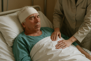 Morning light cuts through the curtains. A man wakes up on a leather couch, his head is pounding. He hears…