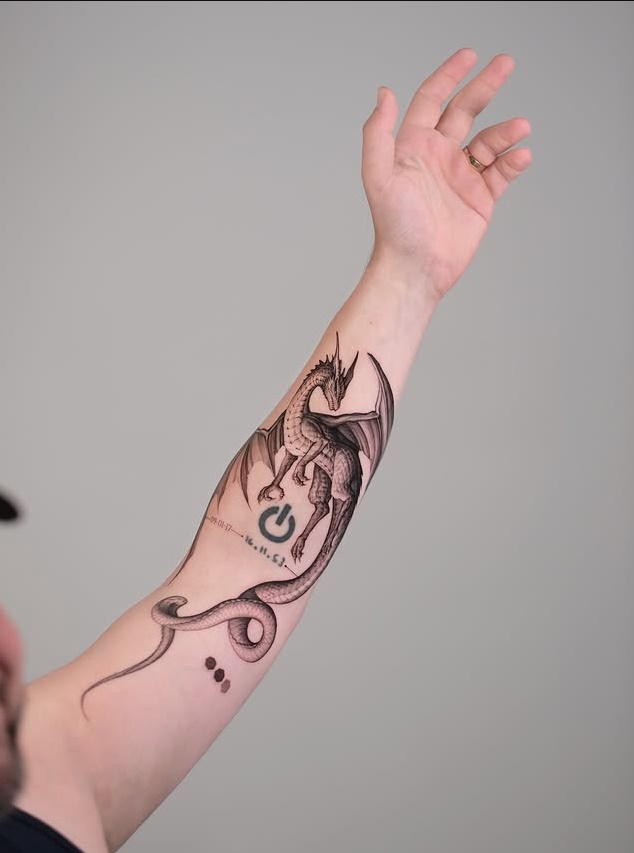 “We came up with this dragon, coiling around a preexisting tattoo he already had, this dragon is a fun and personal reference to the bond he shares with his kids, along with some important dates and symbols that only those who know, will know. Thank you for trusting me with your vision, see you soon again! Done at @monolithstudio.”