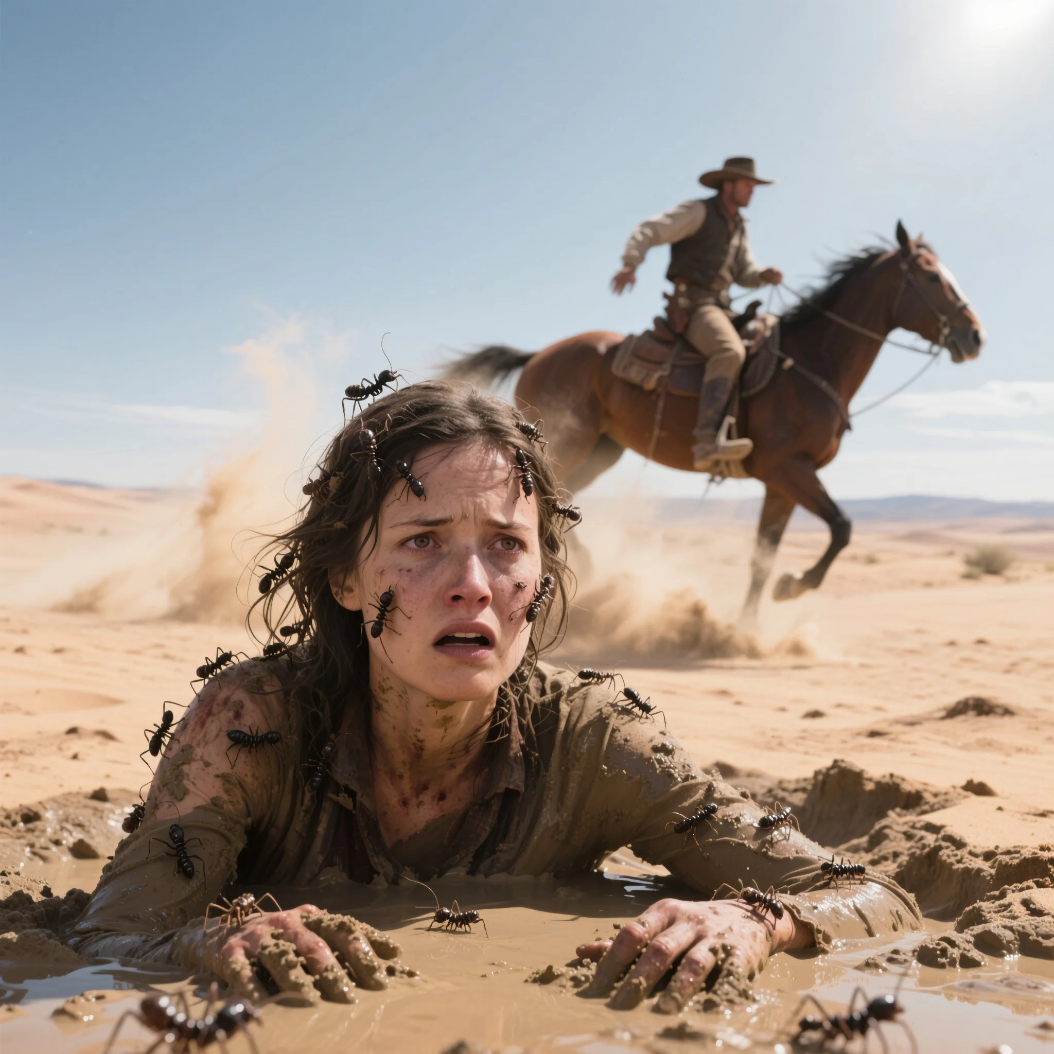 He approached cautiously, his hand poised on his revolver, because in Arizona even the dead could be a trap. As he bent down, he saw the face. It wasn’t just any corpse; it was a woman. Her chest rose and fell weakly, as if the air refused to leave her. Ants swarmed across her skin, and her gaze pierced him like a spear.