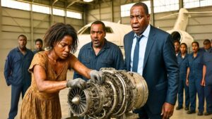 Inside the hanger at Lagos airport, a silent crowd of engineers circled a giant silver jet engine resting on a wheeled stand. Red tool cart stood open. A clock on the wall ticked too loudly. A billionaire in a navy blue suit checked the time again. Engineers wiped sweat. Security watched the doors. Then a clear voice cut through the noise. If you permit, I will fix it.
