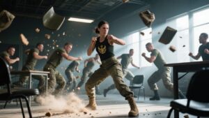 Sarah simply maintained her ready position, her dark eyes focused and alert. The other recruits formed a circle around the mat, their own training forgotten as they prepared to witness what promised to be a revealing encounter. “Begin,” Rodriguez commanded. Dererick immediately moved forward aggressively, throwing a quick jab, intended to test Sarah’s reflexes and defensive capabilities.
