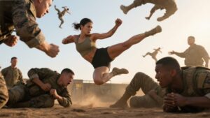 She performed the required moves competently, but without flare, earning nods of approval from the instructors, but no special attention. To everyone watching, she looked like a recruit who had learned the basics but wasn’t particularly gifted at combat. Then came the moment everyone had been waiting for, the sparring matches. Sergeant Johnson began calling names randomly, creating pairs that would fight three-minute rounds. The first few matches were predictable.