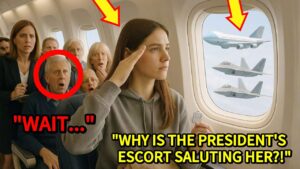 Amelia raised her hand in a slow salute to the sky, her eyes blazing with something fierce and alive. The commercial plane banked slightly, following Air Force One’s lead, while the F-22s tightened their formation. A young mother named Emma, cradling her sleeping toddler, looked at Amelia with wide, pleading eyes.