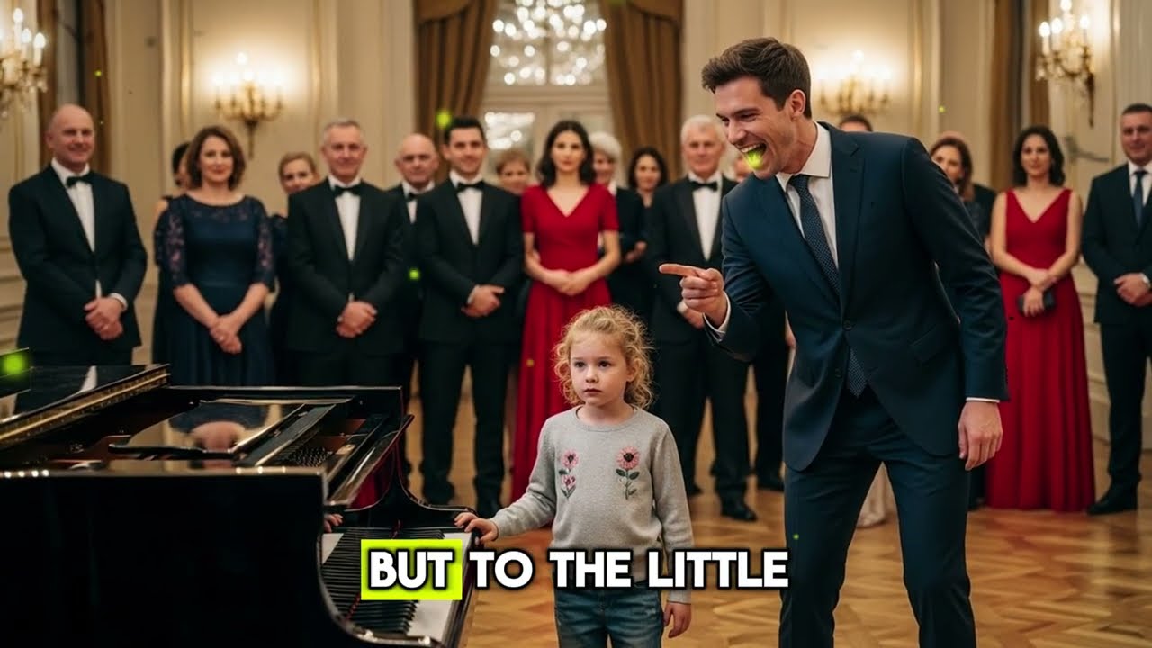 The grand ballroom shimmered beneath golden chandeliers, casting glare across the immaculate marble. The laughter of the wealthy guests echoed like cruel bells throughout the vast room. In a corner, almost invisible, stood a little girl. Fragile, tiny, her hands trembled over the polished keys of a grand piano. Her clothes were simple, her shoes worn, yet her eyes shone with a quiet determination that seemed to pierce through the magnificence that surrounded her.