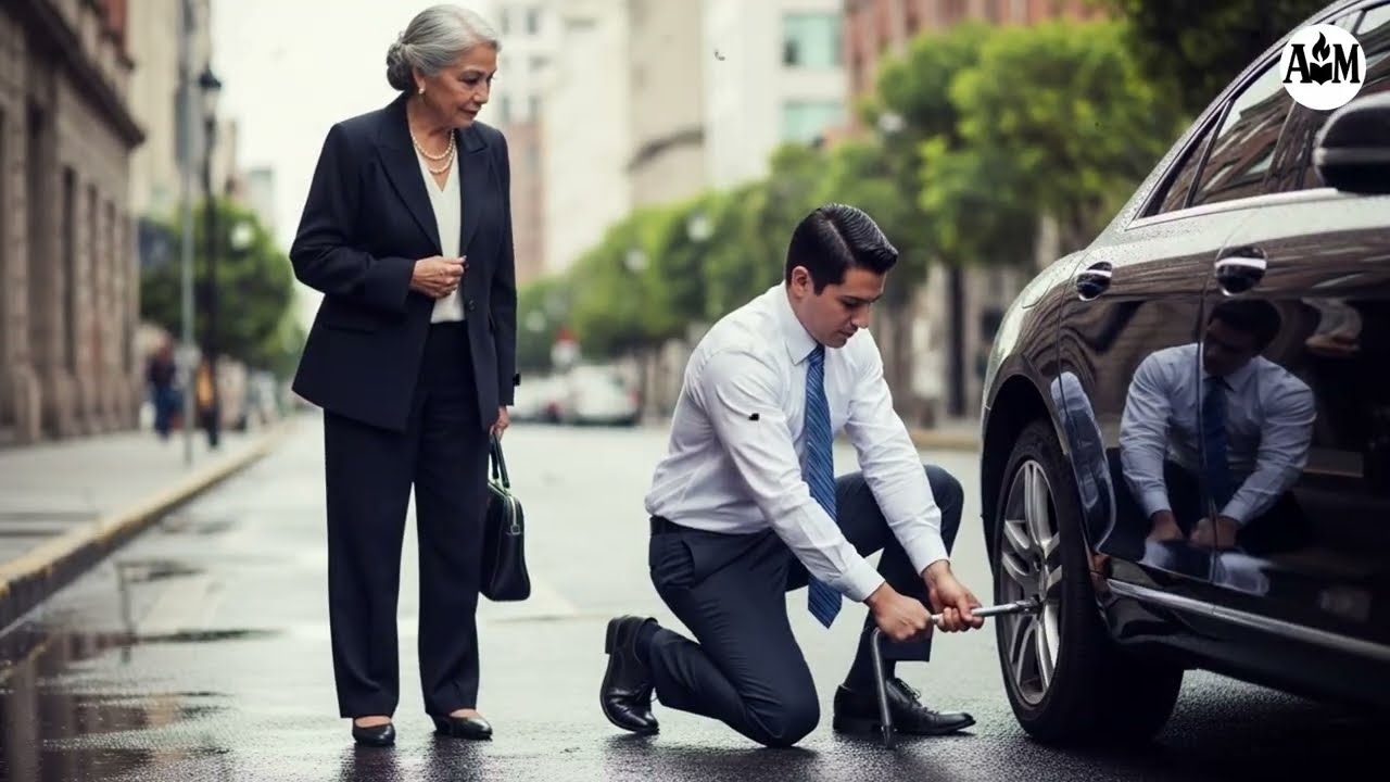 As he walked toward the imposing glass building, a sharp crack rang out behind him: the pop of a tire. Instinctively, he turned and saw a luxury car pulled up to the side of the road. Next to it, an elegant elderly woman with gray hair pulled back in a bun stared at her flat tire with a worried expression. Her dark suit exuded authority, but her eyes betrayed a deep unease.