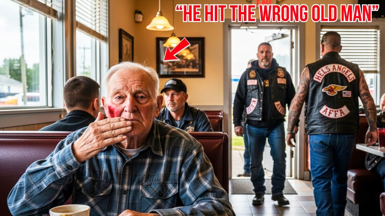 In a quiet diner, an old man sat alone, trembling but proud. Moments later, a thug’s hand cracked across his face, silencing the room. Nobody moved. Nobody spoke. But 1 hour later, the door swung open and the silence broke. When his son walked in with Hell’s Angels, welcome to Shadows of Dignity.