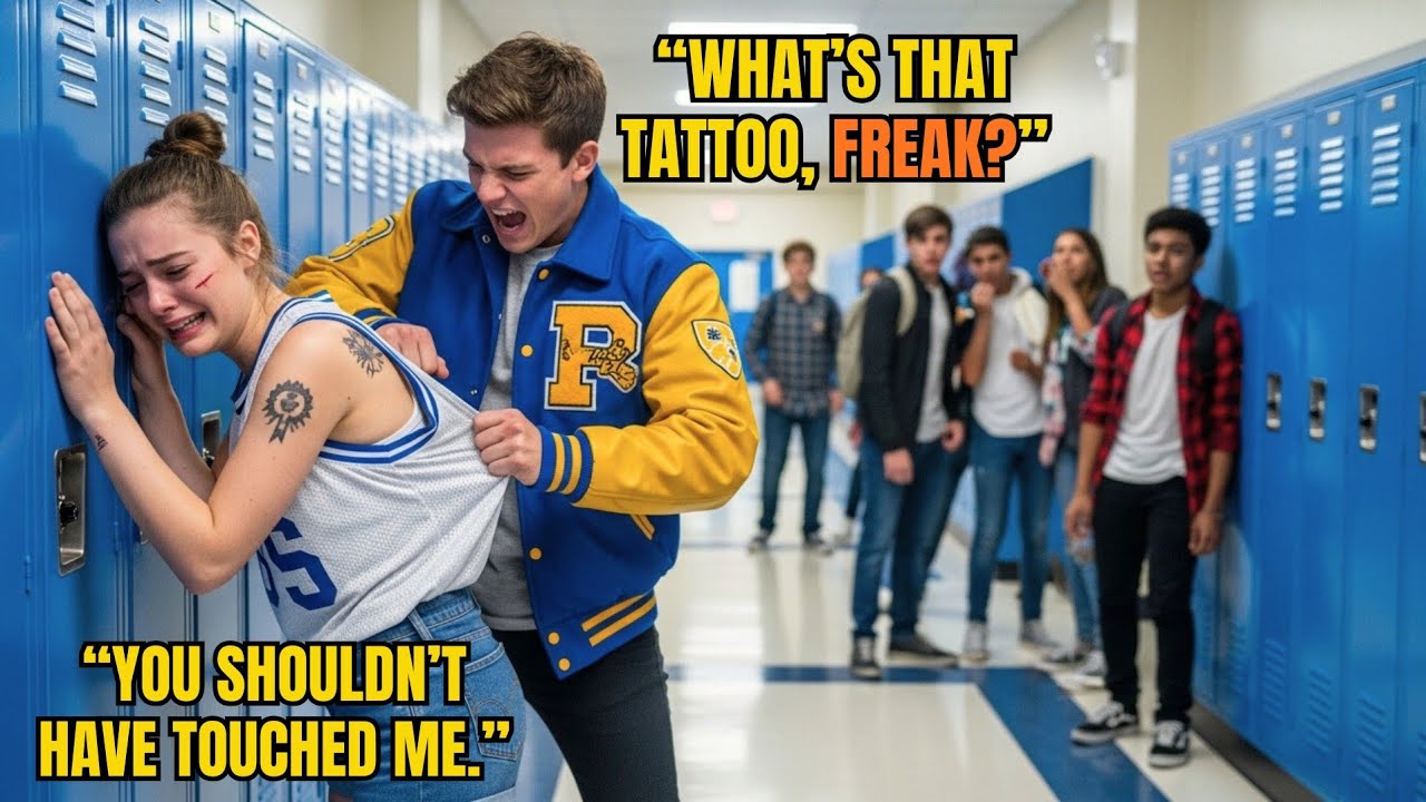 A girl and the ghost in her skin. Jake backed into a corner by his own pride. And the terrified eyes of his peers made the second worst mistake of his life. His fight or flight instinct trained on the football field chose fight. With a roar of fear disguised as anger, he lunged at her fist, pulled back. He never made contact. Elara’s body moved with an economy of motion that was terrifying in its efficiency. It wasn’t a dodge, it was a flow. She stepped inside his swing, her own hands moving in a blur. One hand deflected his punch, the other struck the nerve cluster on his inner bicep. His arm went numb as he gasped in shock and pain. She hooked her foot behind his ankle and swept his legs out from under him. The 220 lb linebacker crashed to the lenolium with a thunderous impact that shook the lockers. He lay there winded, humiliated, and utterly bewildered. The tattoo growled, a sound of deep satisfaction. “Andruff wok boy,” stood over him, not triumphant, but resigned, as if this was a script she’d hoped never to have to follow again.