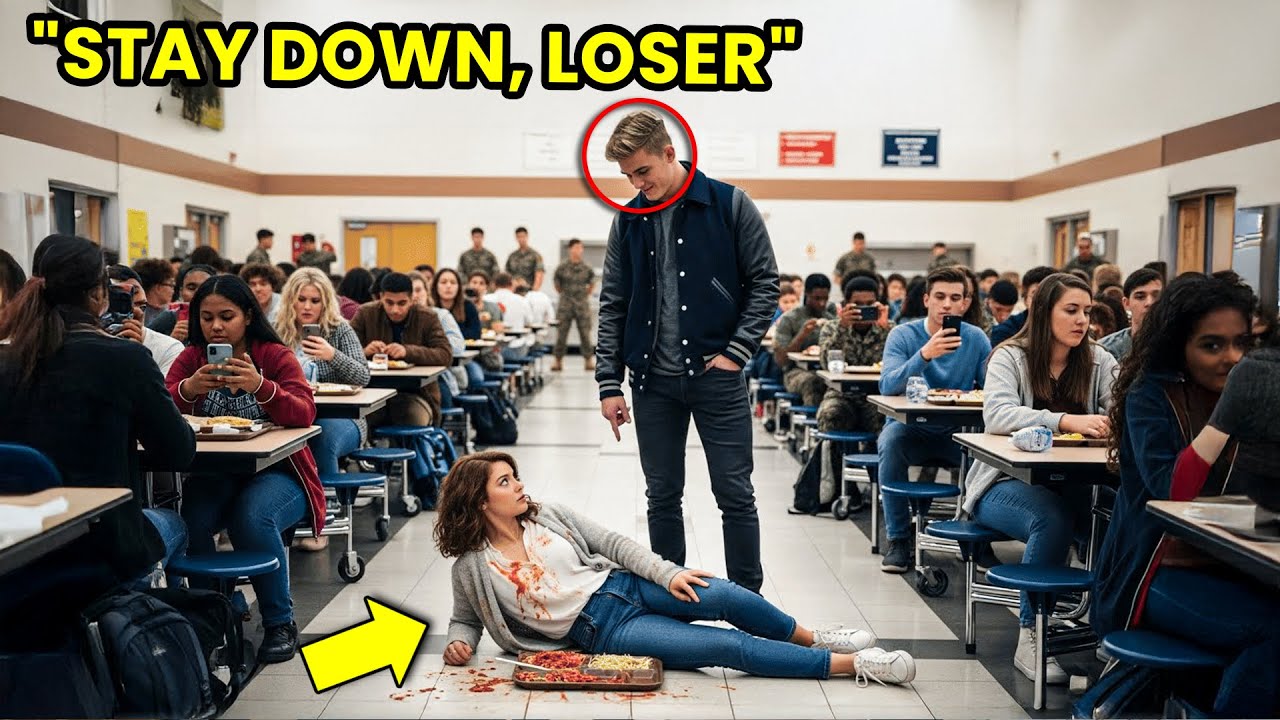Talia Rowan does not see it coming. She is walking back to her seat, Trey balanced carefully, eyes fixed on the empty corner table she has claimed as her territory for the past 3 weeks. The new girl, the quiet one, the daughter of someone she refuses to name. Miles appears behind her. His shoulder connects with her back. Not an accident, a calculated strike.
