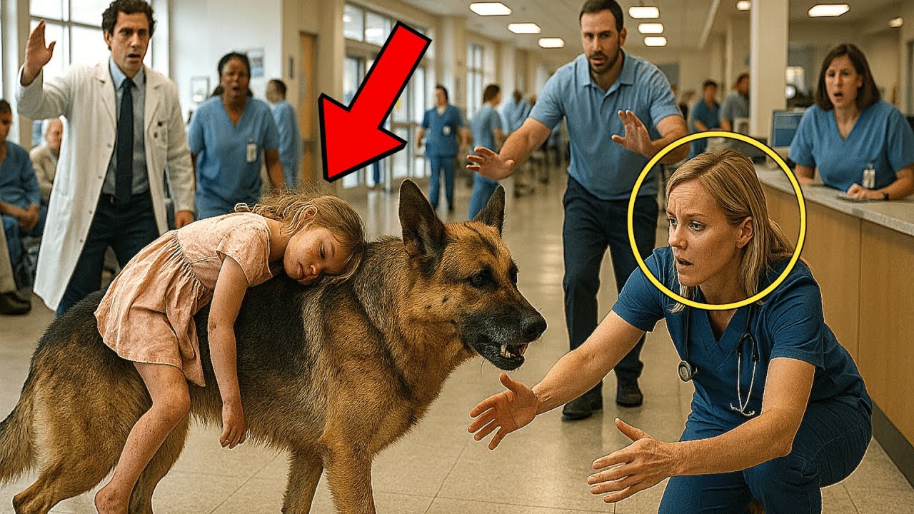 The air buzzed with urgency. Doctors barking orders, nurses rushing past gurnies, phones ringing without pause. Then suddenly everything stopped. Through the automatic glass doors walked a German Shepherd. He wasn’t just any stray. On his back lay a little girl, limp and unconscious, her small hands dangling by his side.