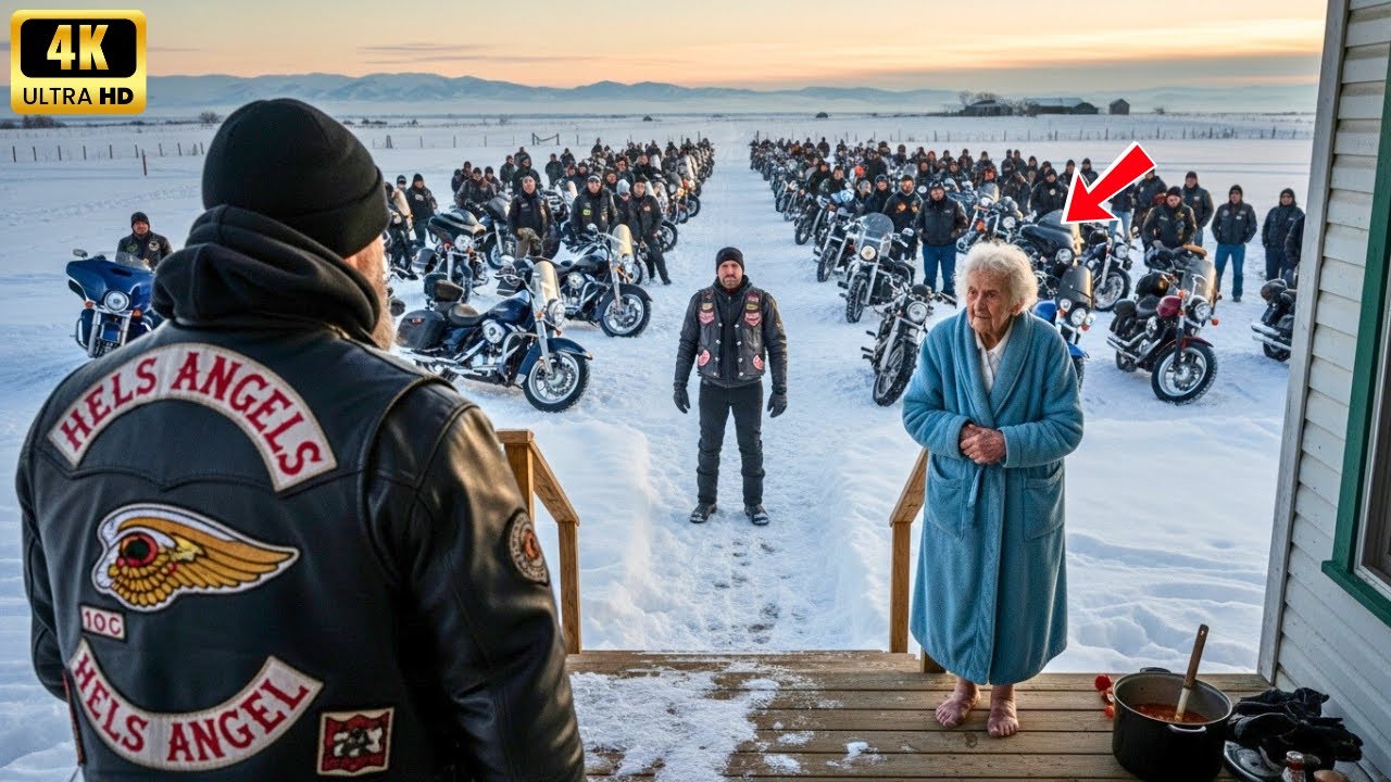 Snow slammed against the old farmhouse windows. The night was bitter and the wind howled like it carried secrets. Then headlights cut through the storm. One bike, then another, then 15. Engines roared outside her lonely home. She stood by the door, trembling as strangers and leather surrounded her porch.