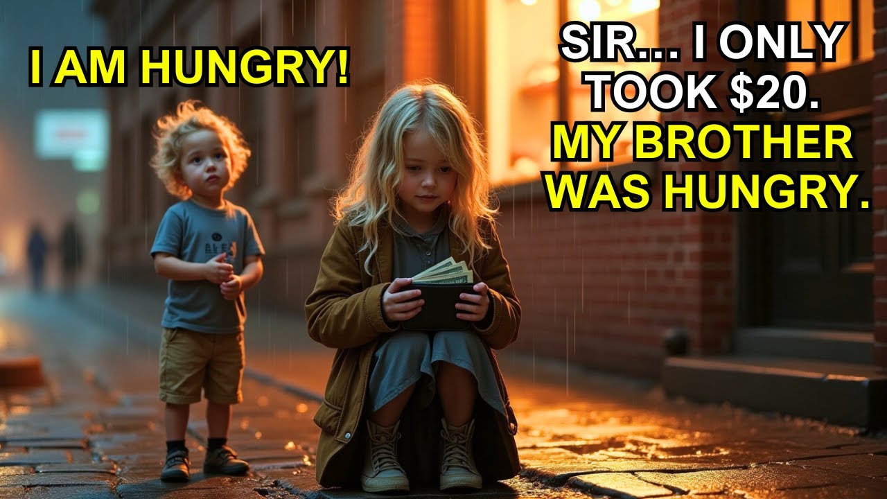 Hours later, as the city light shimmered in puddles, a little girl named Ella Grace spotted the wallet near the bakery door. She was seven, her coat too thin for the October wind. Her brother Sam, five, clung to her hand, his lips blue from cold. “Maybe there’s food money,” he whispered. Ella opened the wallet with trembling fingers. The bills inside could feed them for months.
