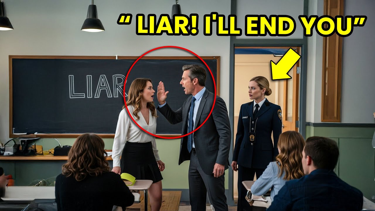 The slap connects with the side of Emry’s face. The sound cracks through the silent room like a gunshot. She staggers sideways, catches herself on a desk, then falls to her knees. Her hand rises to her cheek, already reddening, already swelling. “Liar.” Keller’s voice thunders above her. His composure shatters completely, revealing the monster beneath the professional mask.