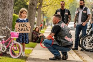 Her blonde hair was messy, her dress too clean for her worn-out shoes. Beside her stood a pink bicycle with a white basket. In her tiny hands, she held a cardboard sign: “For Sale.”