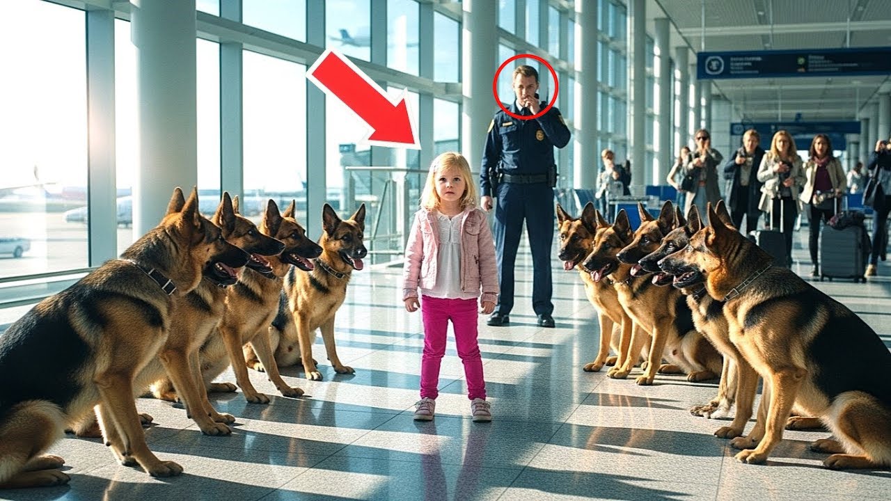 “It was supposed to be an ordinary morning at the airport until something unbelievable happened. Passengers froze in their tracks as 14 police dogs suddenly broke formation, surrounding a tiny blonde girl standing alone near gate 12. No one dared to move. Without warning, the dogs began barking wildly at the little girl. She took an uneasy step back.