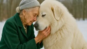 Atlas took one step forward then another his leash went slack as Jennifer followed too curious now to redirect him the dog moved with unusual care his paws making almost no SoundOn the linoleum floor when he reached the rocking chair he lowered himself into a sitting position and simply waited for a long moment the old woman did not seem to notice him then slowly as if waking from a dream she turned her head her eyes still sharp despite their pale blue colour faded by time widened slightly she looked at the enormous white dog then at Jennifer standing in the doorway then back at the dog