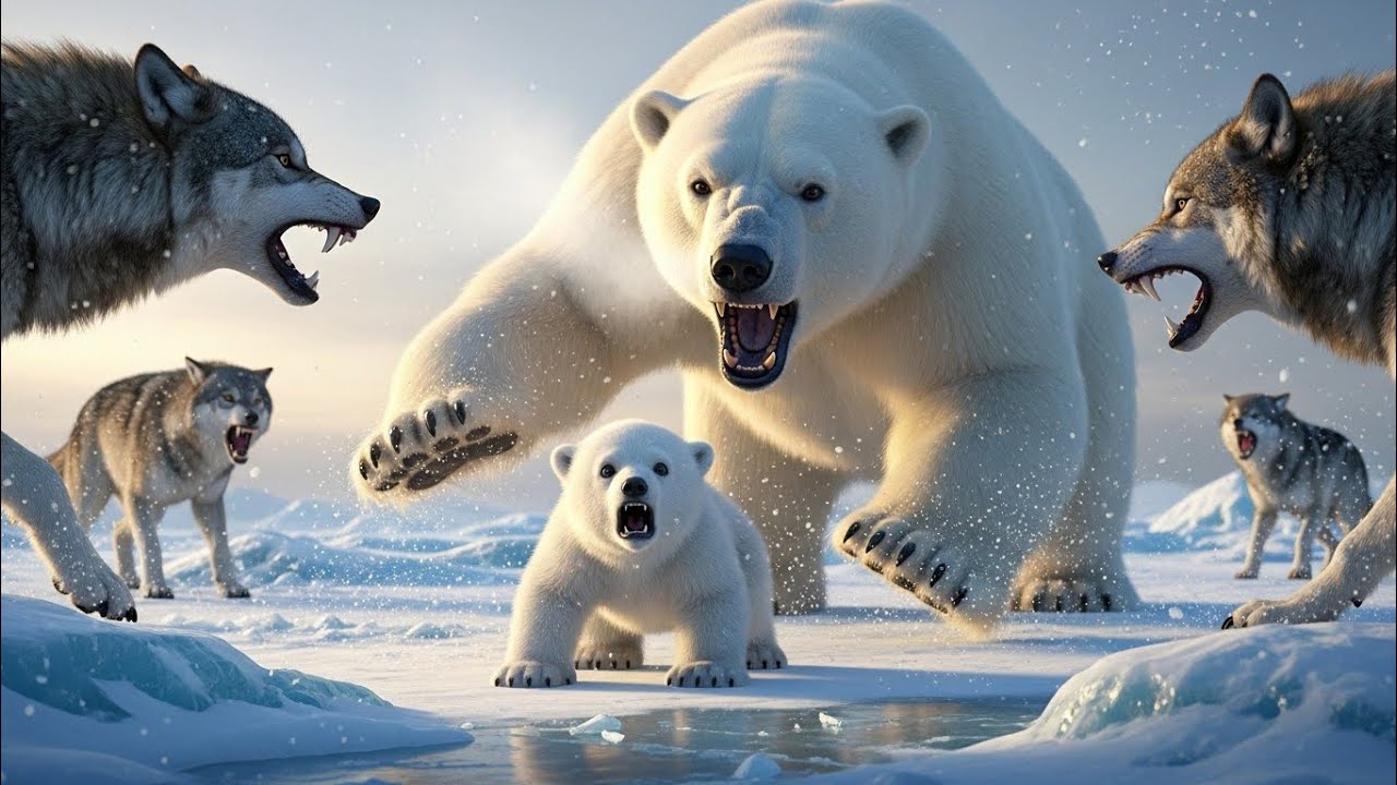 The ice itself seemed to shiver under the intensity of the battle. Snow whipped in blinding sheets, kicked up by the stamping feet of predator and defender alike. The cub’s small body pressed close to the mother, every nerve on fire with fear. claws scrabbling in frantic desperation for purchase. A wolf lunged again, and the mother pivoted with inhuman precision, teeth snapping in warning, jaws clashing inches from the cub’s fur.