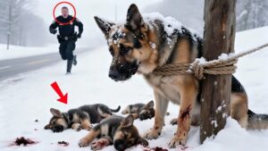 A German Shepherd tied to a wooden post, her fur caked with ice, her body shaking uncontrollably. At her feet lay tiny forms half buried in snow. puppies. Daniel’s heart pounded as he knelt down, brushing frost from their motionless bodies. One twitched weakly, another barely breathed. The mother didn’t growl or move.