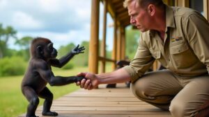 He pushed open the heavy door and found the baby gorilla standing on the porch, making high-pitched cries of pure terror that sent chills through Marcus. This wasn’t a playful sound. It was a cry for help. Marcus, who had learned to respect the rules during his 30 years working in the field, got down on one knee, ignoring the risk to meet the small animal at eye level.