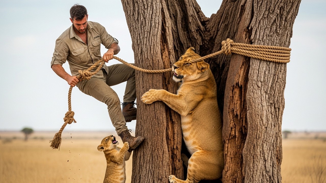 The lioness lurches, claws scraping for grip. Evan’s heart pounds. He loops the rope under her chest, ties it off, and pulls. His muscles burn like fire. The cub’s screams hit a fever pitch. One more heave. Evan roars. Every ounce of strength poured into this moment. The trunk splinters. The lioness tumbles free, crashing to the ground in a heap of fur and dust.