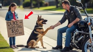 The man stopped his roaring bike when he saw her. A little girl, no older than seven, standing by the roadside. Her sign read, “Duke, good dog. $50 or best offer.” But it wasn’t the sign that broke him. It was her eyes. They were filled with hunger, fear, and something else. Desperation. The little girl’s voice was trembling.