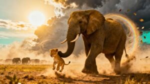 The vultures already circle above the acacia trees. Each minute the sun grows harsher, pressing down like fire. The cub staggers forward, paws sinking into the dust, calling again. But no one answers. And yet someone hears. Far across the plane, a herd of elephants grazes in uneasy quiet. Their matriarch Amara lifts her head, her eyes narrow.