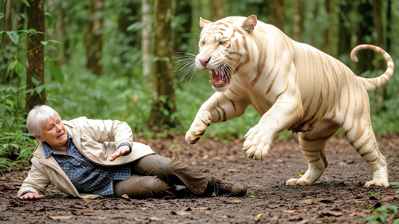 20 ft away stood the ghost. A massive white tiger. Pure albino. Pink eyes glowing like embers in the green gloom. Old scars crossed his pale coat like lightning bolts. 450 lb of living myth. Staring straight at a 70-year-old woman who could barely stay upright. Helen Brooks felt her heart trying to climb out of her chest.