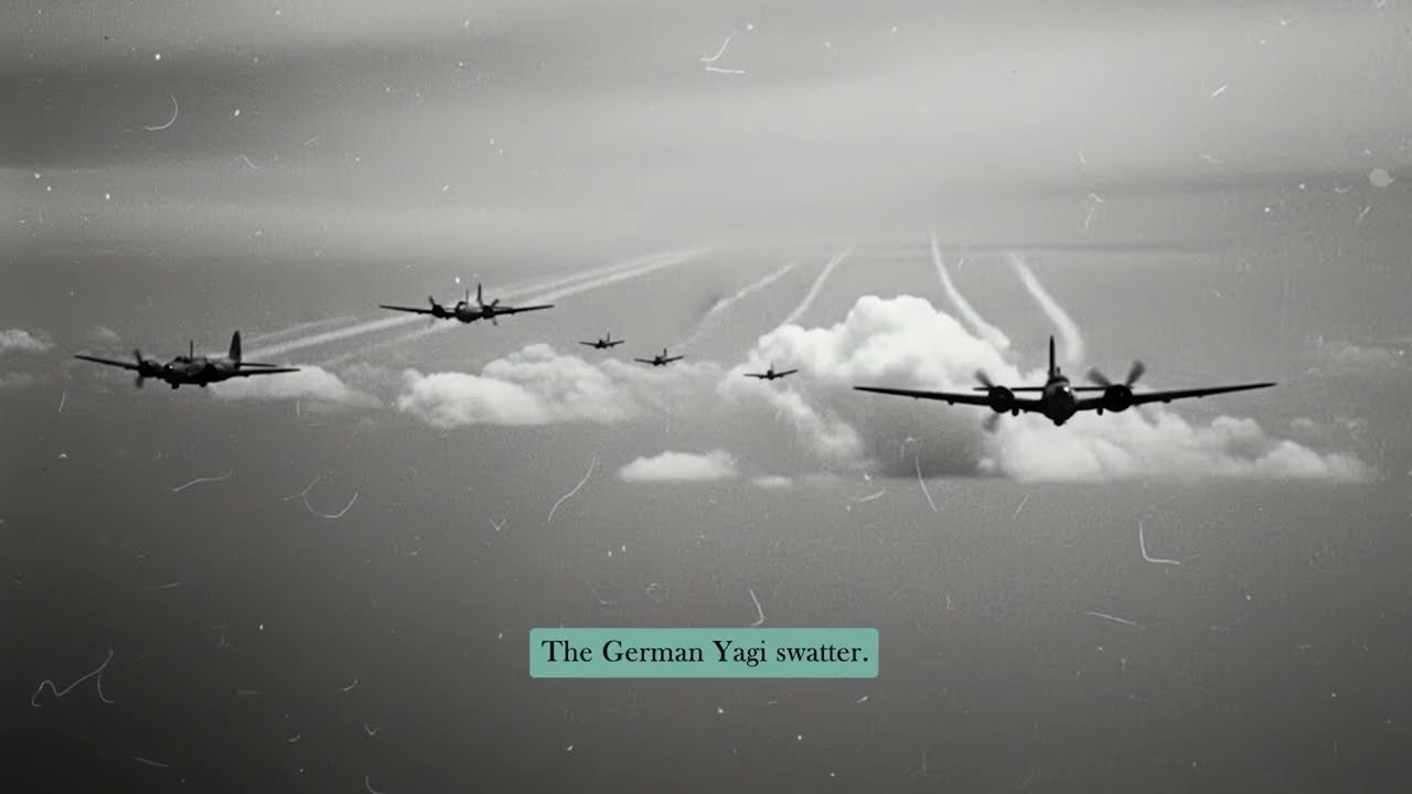You know that for the next hour or more, you are on your own. And the Germans knew it, too. This gap of death was a calculated kill zone. The German Yagi swatter. Their fighter wings, would gather their forces in wait. As soon as the escorts left, they would pounce. They attacked in waves, sometimes 100 at a time. Flying through bomber formations and head on attacks, cannons blazing.