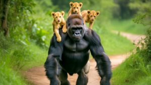 In the silent tension that followed, Zuri made her choice. It wasn’t rushed or driven by instinct alone. It was deliberate, almost ceremonial. With a tenderness that defied her enormous frame, she leaned in and began to gather the lion cubs one by one. She used both arms as gorilla mothers do, holding them close against her chest with surprising precision.