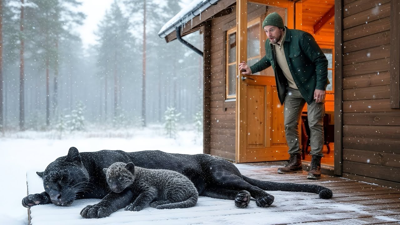 He opened the door and the world went silent. A black panther lay on his porch, looking more like a statue of ice than a living creature. Tucked beneath her was a cub. So still, it might already be gone. Evan’s mind, drilled with years of wilderness protocol, flashed with warnings. Apex predator, unpredictable, lethal.