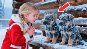 Two tiny whimpers, so soft they almost disappeared in the wind. She ran to the front door and pulled it open just enough to peek outside. What she saw made her heart stop. Two German Shepherd puppies sat huddled together on the porch steps, shivering violently, their fur covered in ice. Their little bodies were so cold they barely moved.