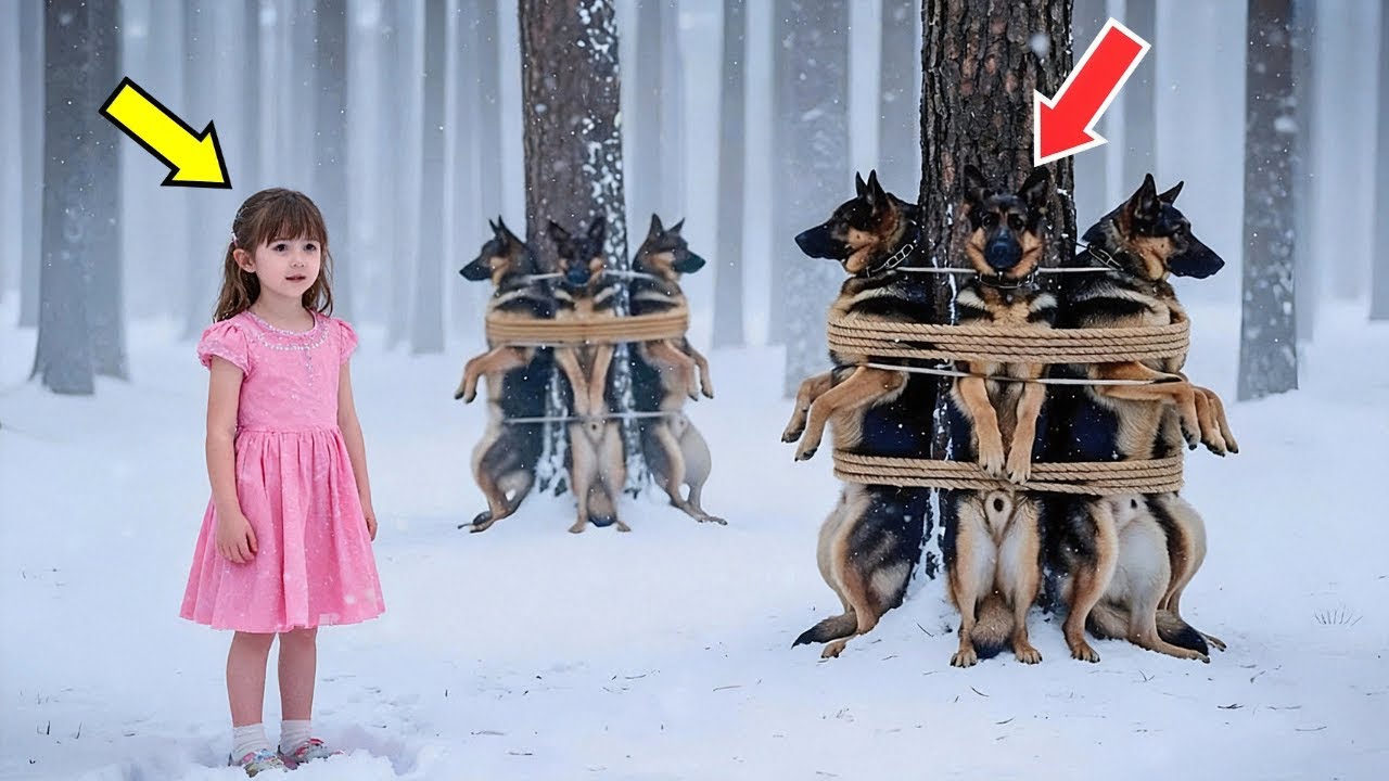 Her tiny hands curled into fists. Her eyes widened until they shimmerred with fear and disbelief. Because before her stood a sight no child should ever witness. 15 German shepherds, huge, strong, majestic dogs were tied upright against the trees. Their bodies were wrapped tightly with thick rope, pinning their legs in place.