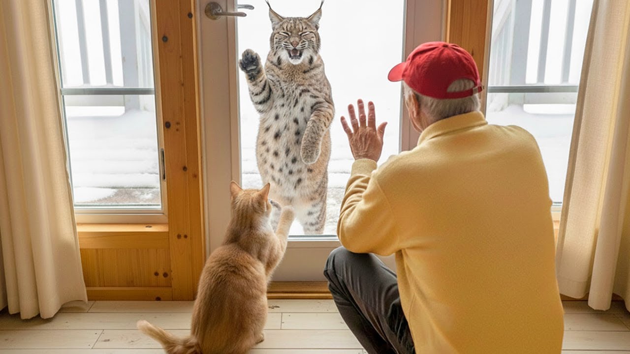 Without hesitation, he opened the door wider. The bobcat didn’t move immediately. She seemed to be calculating risk, weighing survival against instinct. Harold stepped back, giving her space, keeping his movement slow and unthreatening. Copper watched from behind Harold’s legs, his tail twitching with uncertainty. Finally, the bobcat stumbled forward, crossing the threshold into the cabin.