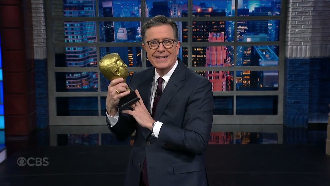 “It looks like the poster for a movie called Zombie Planet 3 exclusively on a service called Plumbbo with Ads,” Colbert quipped, pointing to an image of the gaudy plaque presented to Trump.