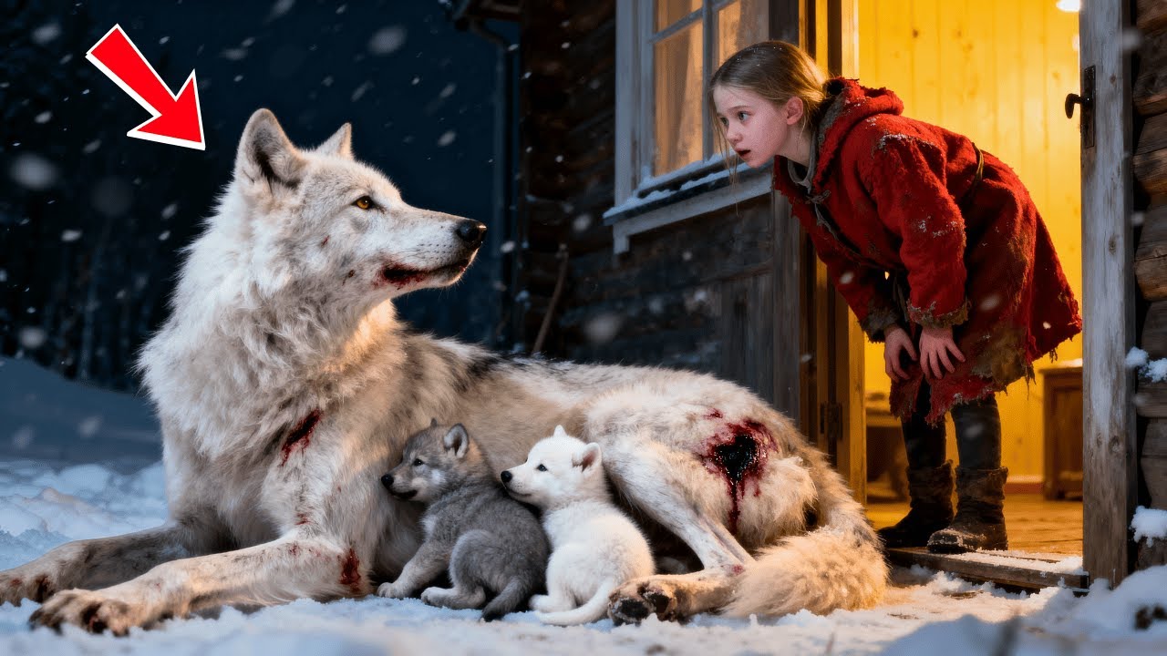 The scratching at the door cut through the howling blizzard like a dying prayer. Grace’s hand trembled on the frozen handle, her breath misting in the December cold. When she pulled it open, her 12-year-old heart stopped. A grey wolf lay crumpled in the snow, blood spreading dark beneath silver fur. Three white cubs huddled against their mother’s heaving sides, their golden eyes wild with terror.