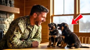 Inside, the air smelled of pinewood, melted wax, and life returning from the edge. Near the fireplace, two tiny German Shepherd puppies lay wrapped in Logan’s old military blanket. One breathing shallowly, the other already strong enough to nudge at the other’s ear as if to remind it not to give up. Logan sat nearby on a wooden chair, his elbows resting on his knees, staring into the fire with the kind of focus soldiers learn from too many nights spent waiting for something to happen.