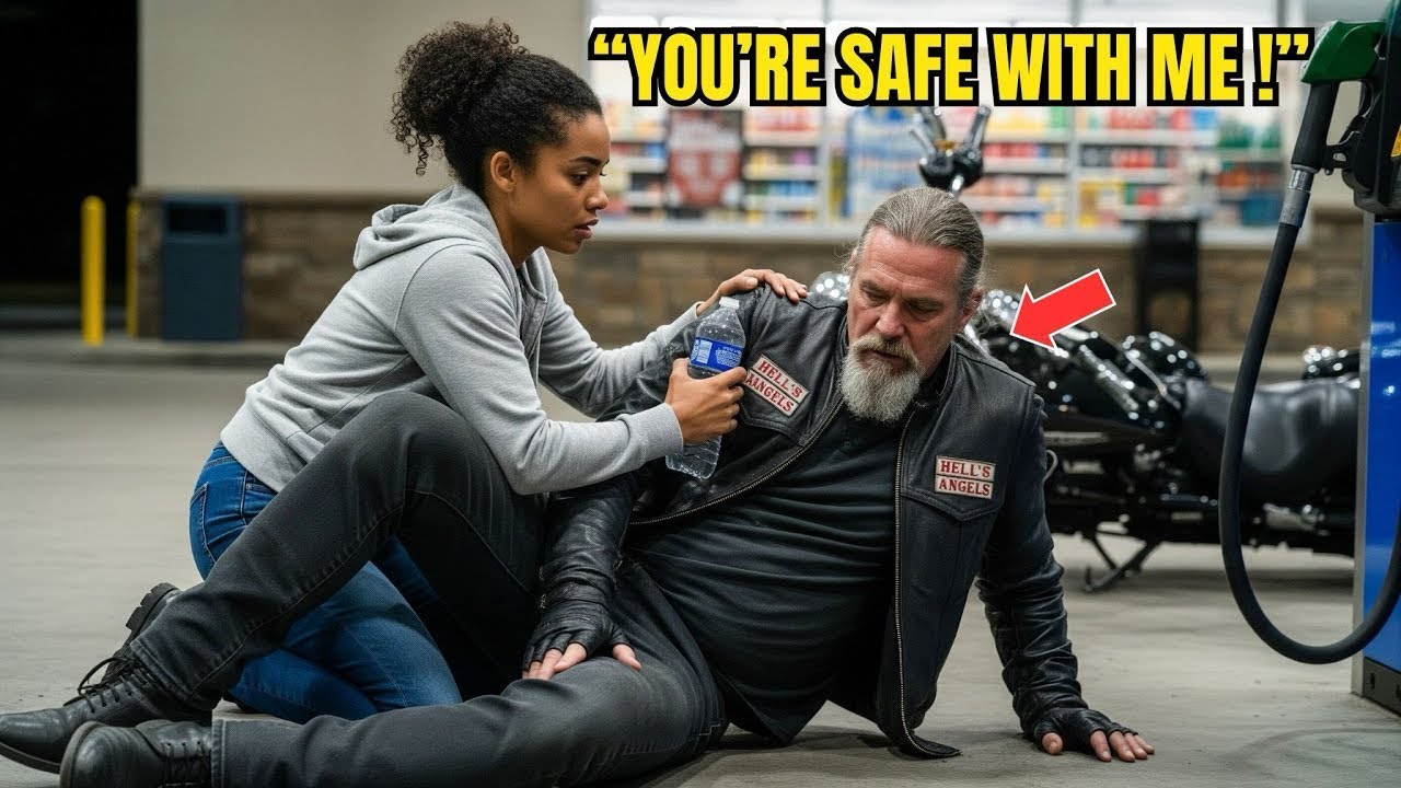 She wiped her hands on a towel and opened the door halfway. The man from the gas station stood there. Life taller than she remembered. His leather jacket hung open, bandages visible beneath it, the same gray eyes sharp now, studying her in silence. Maya froze. “You,” he nodded once. “Yeah, you saved me.” His voice was rough, deep, like gravel dragging against concrete.