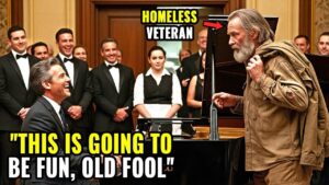 Now, let’s step back into the moment. He had lived through gunfire and explosions, but this glittering hall was a different battlefield. A weary figure, swallowed in a coat older than most of the guests, stood before a sea of tuxedos and silk gowns. His request for food, spoken in a worn out voice, was about to tear apart the illusion of their perfect world.