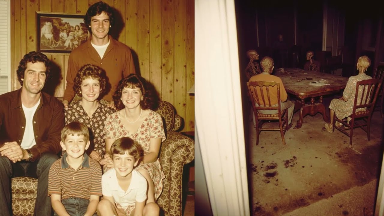 A table, five chairs, and in each chair, skeletons dressed in 70s clothing, sitting as if they were still sharing a meal. Frank dropped his flashlight. Mike screamed and stumbled up the stairs, climbing rapidly. Frank stood frozen for a moment, unable to process what he was seeing.