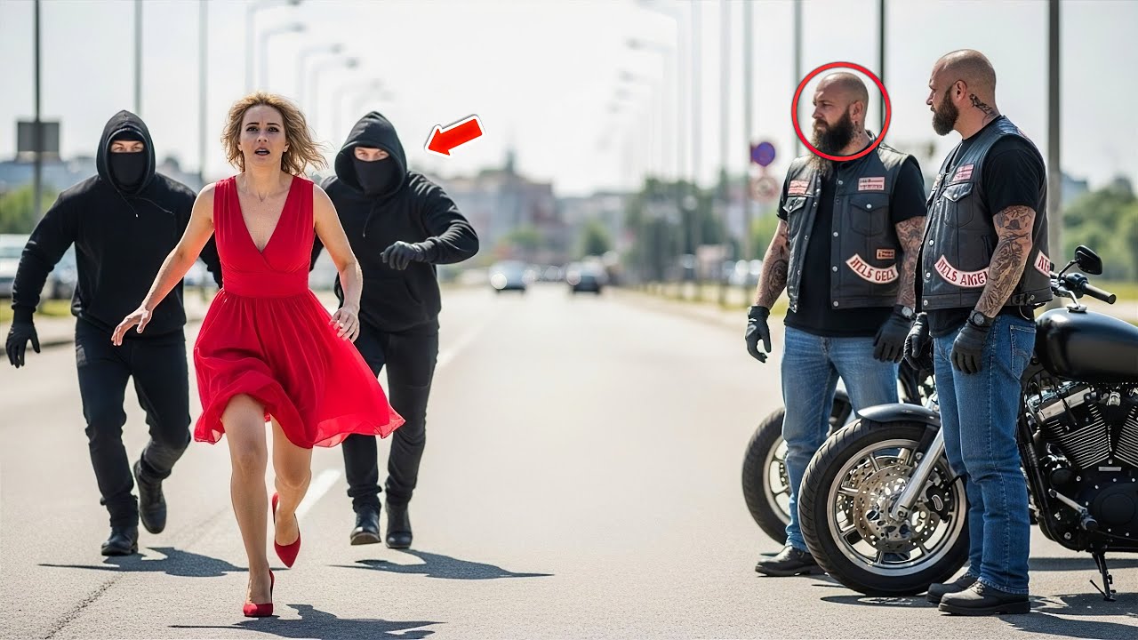 The closest biker, a tall broad man named Ror, noticed her first. His expression shifted from neutral to sharp focus as he saw the terror etched across her face and the masked men charging after her. The other two, Griffin and Maddox, straightened, their posture tightening like coiled steel. They didn’t need an explanation. The truth was written clearly in the way she stumbled toward them, desperate for help, her red dress fluttering violently in the hot breeze.