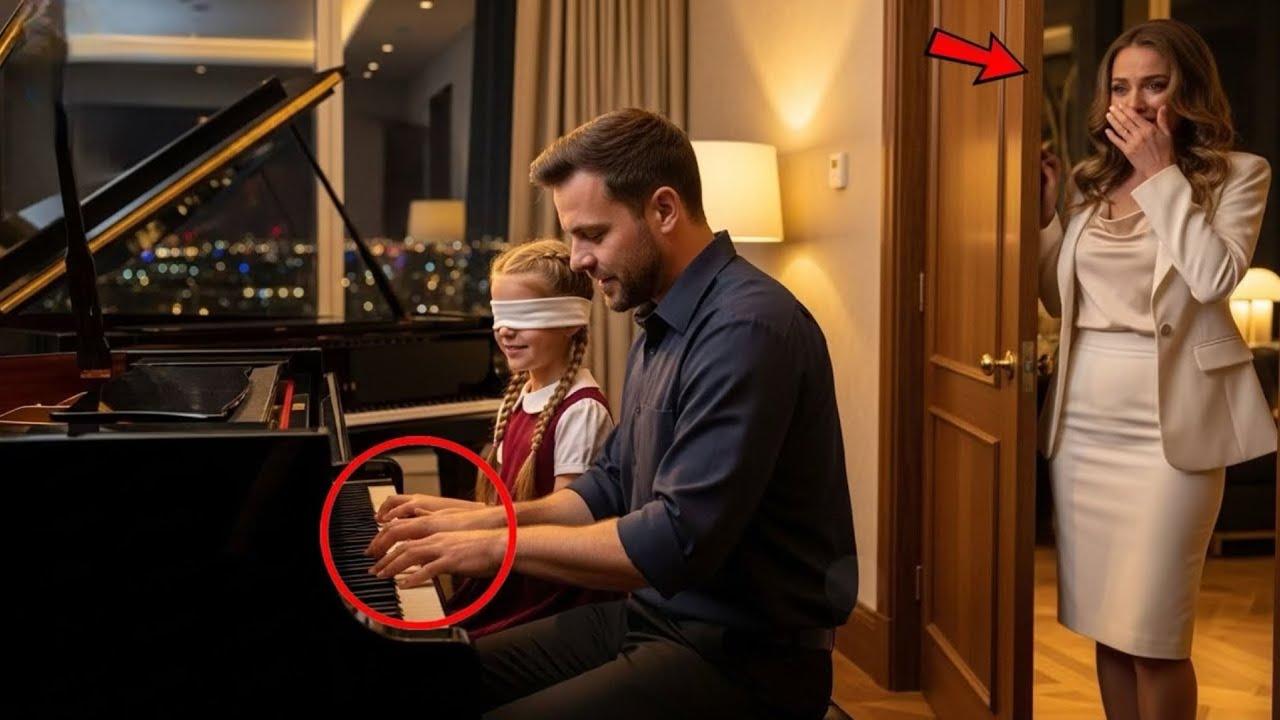 Inside a small girl sits at the grand piano, shoulders tense, fingers trembling over the keys. The melody is cla but broken. A beautiful thing struggling to breathe. Ethan stands in the doorway listening. She tries again, misses a note, size, and lowers her hands. Don’t stop, he says quietly. The girl turns toward his voice.