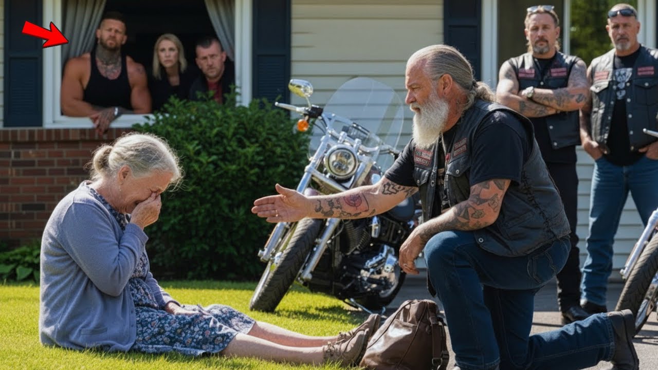 That night, Margaret sat on a park bench across from her house, watching the lights inside flicker through the curtains. Her heart ached as laughter echoed from inside her own living room. The next morning, as she sat crying quietly, a deep rumble filled the air, the unmistakable growl of motorcycle engines. Six bikes rolled down the street, chrome gleaming in the sunlight.