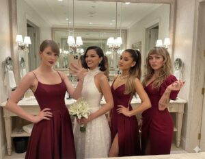 This sparkling moment also featured some of Taylor’s closest friends. Selena Gomez, with her signature warm smile, seemed to playfully tilt her head towards Taylor’s hand, drawing attention to the stunning piece of jewelry. Ariana Grande, also at the wedding, could be seen glancing down at the ring, intrigued by its size and brilliance, while Miley Cyrus posed confidently but couldn’t resist casting a curious look at the diamond.