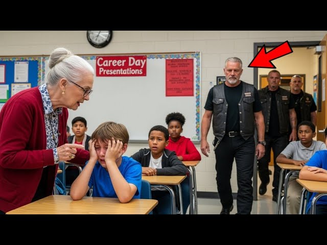 But fate was cruel enough to time things perfectly because at that exact moment the classroom door swung open and 10 leatherclad men walked inside. The room froze. Even Ms. Granger stumbled backward. Standing at the front was Ethan’s father, Cole Walker, his stern face trembling with heartbreak as he saw his son crying. Behind him were nine massive men from his motorcycle club. men with weathered faces, powerful builds, leather jackets heavy with patches, and expressions that held something raw and fierce.